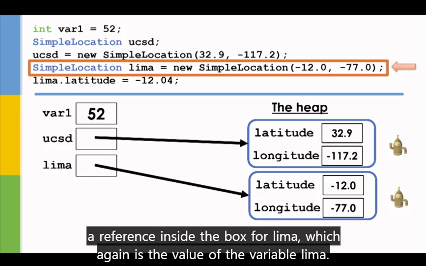 이후 lima는 heap의 객체주소를 가지고 그 값을 가리키게 되며 마지막으로 lat의 값을 -12.0으로 변경한다.